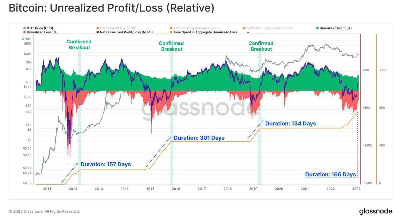净未实现损益比率显示,最近的反弹已经使比特币的现货价格高于更广泛市场的平均收购价格。这使市场重新进入一种未实现利润的状态,在这种状态下,平均持有者又回到了盈利状态。比较过去所有熊市中负NUPL的持续时间,我们观察到当前周期与2011-12年以及2018-19年熊市之间的历史相似性。2015-16年的熊市在持续时间方面仍然很突出,未实现亏损的时间几乎是亚军的两倍长。