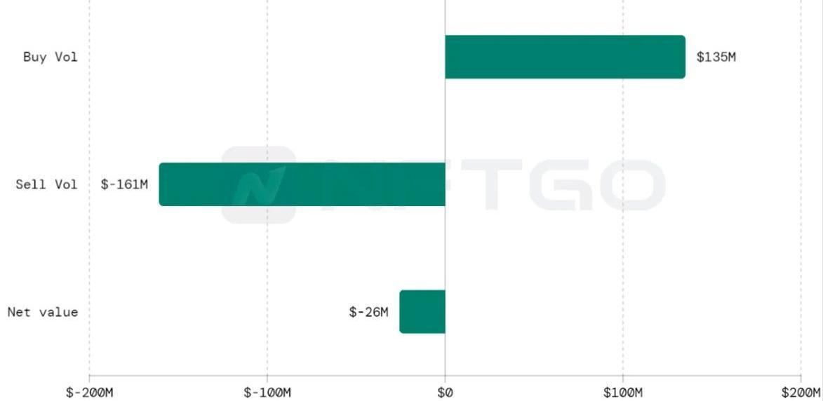 6-12月巨鲸资金规模趋势线(Source:NFTGo.io)除了资金规模,5月份以后NFT市场也开始了巨鲸卖出规模持续高于买入规模的情况,净流入资金多次转为负值,虽然5月份已有部分巨鲸开始抛售,但真正资金出逃是在6月,总计出现了125.4万美元的资金净流出,而6月也成为了大部分巨鲸的出逃NFT市场的时间,下图为巨鲸在6月之后的资金流向统计,我们可以看出流出NFT市场的资金规模已经远远大流入的规模。