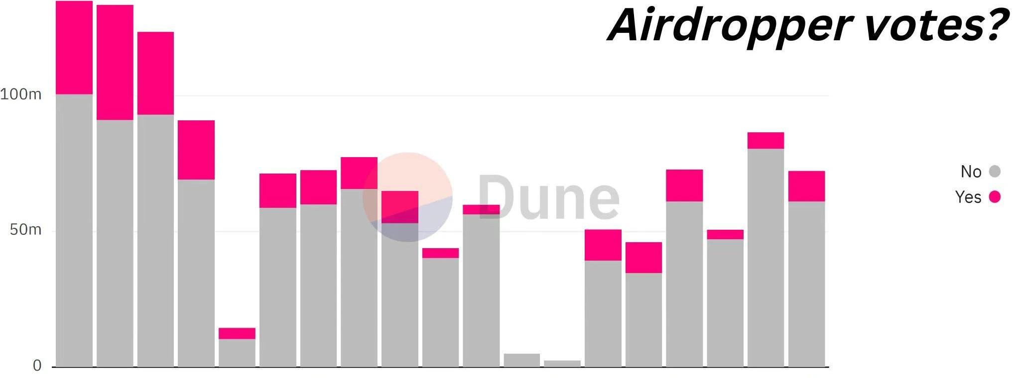 尽管如此,一些获得空投者仍然参与其中,有时甚至占到总票数的25%。所以一些空投巨鲸中的许多人直接参与了这个项目,散户则寥寥无几。