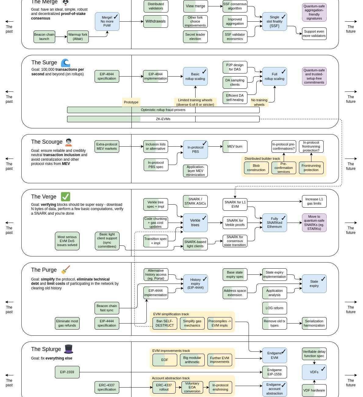 26/30最后的第六阶段,Splurge,目标特别意思:修复一切。比如说EVM,很多东西要优化;比如说VDF,让链上也能产生真正的随机数。VDF其实之前的路线图也有,不过看样子实现VDF需要硬件配合。27/30另外,EIP-4337也是这次路线中的新提案。账户抽象很多人已介绍过,这里再简单说:过去智能合约只能用于链上交易,现在也希望智能合约直接用于你的钱包。比如说:-通过社交媒体直接恢复钱包-项目方帮你垫付gas费-USDT作为gas等。28/30实现它的路径是需要一个新的特殊交易内存池。那些垫付交易全发在这里,由其他人垫付。你发现了么?这个不需要改造ETH。4337方案当年替代方案其实蛮多,但是最终击败其他提案的关键就是它无需修改共识层。大家都喜欢贴补丁,硬分叉对于区块链来说伤害太大。https://eips.ethereum.org/EIPS/eip-433729/30账户抽象其实是蛮好的一件事,虽然这个名字太抽象了,很多人不好理解。但是,这才是massadoption的关键。没有这个东西,ETH绝对无法突破到千万用户级的瓶颈。不过,其实应该把它放到更前面的阶段才好,虽然整体是平行开发的,但是优先级显然有区别。30/30Endgame!以太坊的Endgame是什么样呢?$ETH将是一个非常高性能、安全、节点众多、且具有一定程度抗审查的公链,同时,它还有非常易用的前端和后端,而这个也许会带领我们离开这个遍地依赖信任的黑箱世界。期待那一天。