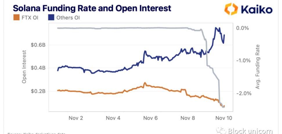我们有理由期待,FTX市场将继续变得更加陌生,用户被困住的时间越长,与现实的联系就越少。接着说Alameda,该公司持有大量的SOL和Solana生态系统代币。FTX也曾是该项目早期的支持者,SBF也经常对该网络给予高度评价。SOL的价格在崩盘中暴跌,FTX上的未平仓合约趋向于0。其他交易所的未平仓合约激增,再加上融资率猛烈下行,表明有大量做空。