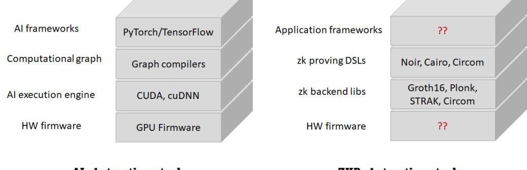 为了释放ZKP的潜力,需要构建多个抽象层和工具,这些抽象对于简化ZKP应用程序的开发过程是必要的——允许每组开发人员专注于他们最擅长的事情,例如应用程序开发人员不应该担心ZK电路的底层细节以及它们是如何工作的。再次使用AI类比,通过创建多个抽象层,AI可以取得巨大进步。使用这些抽象,AI应用程序开发人员无需担心NN架构或硬件资源分配,因为TensorFlow和PyTorch等框架抽象出了所有这些底层细节。