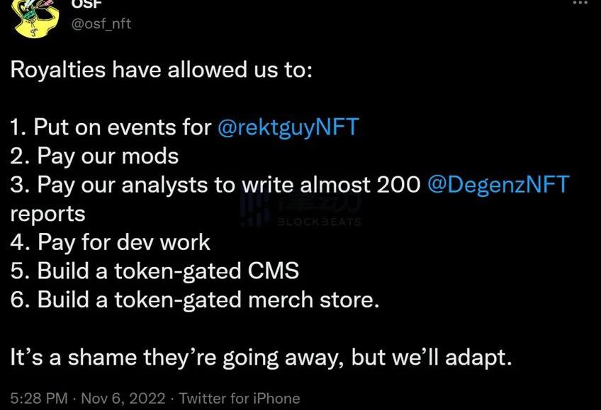 最后,回到文章开篇提出的最后一个问题:Blur的成功,对NFT来说,究竟是好是坏?我的回答是「好」。Blur虽然随着「天时」乘风而起,但是它过硬的产品,才是成功的关键。好产品越多,NFT市场当然越进步。也许你会说,「零版税」让中小创作者/项目方变得更加艰难。是的。毕竟,连OSF都发出了感叹: