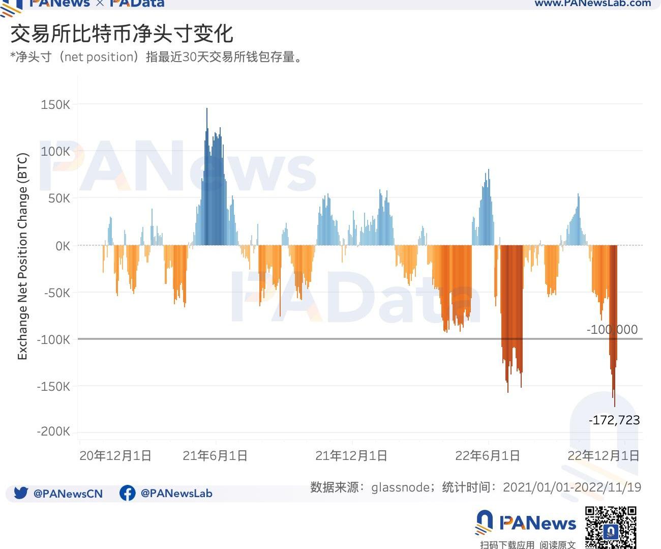 另外值得注意的是,交易所钱包中比特币的净头寸变化,即最近30天的余额存量变化,也发生了明显的异动。根据统计,11月16日,交易所比特币净头寸减少了17.27万BTC,是最近两年来单日变化最大的一天。而且从11月10日开始,交易所比特币净头寸已连续10天减少超10万BTC了。实际上,今年下半年以来,交易所中的比特币存量就在持续下跌,不过近期FTX事件加速了这个过程。