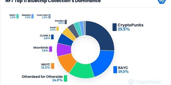 另一方面,得益于为Web3游戏和GameFiDApp提供了丰富的扩展解决方案,ImmutableX的NFT交易量占比达到23.12%和Ronin的NFT交易量占比达到18.81%,已经跻身为NFT交易的主要市场。2、蓝筹NFT