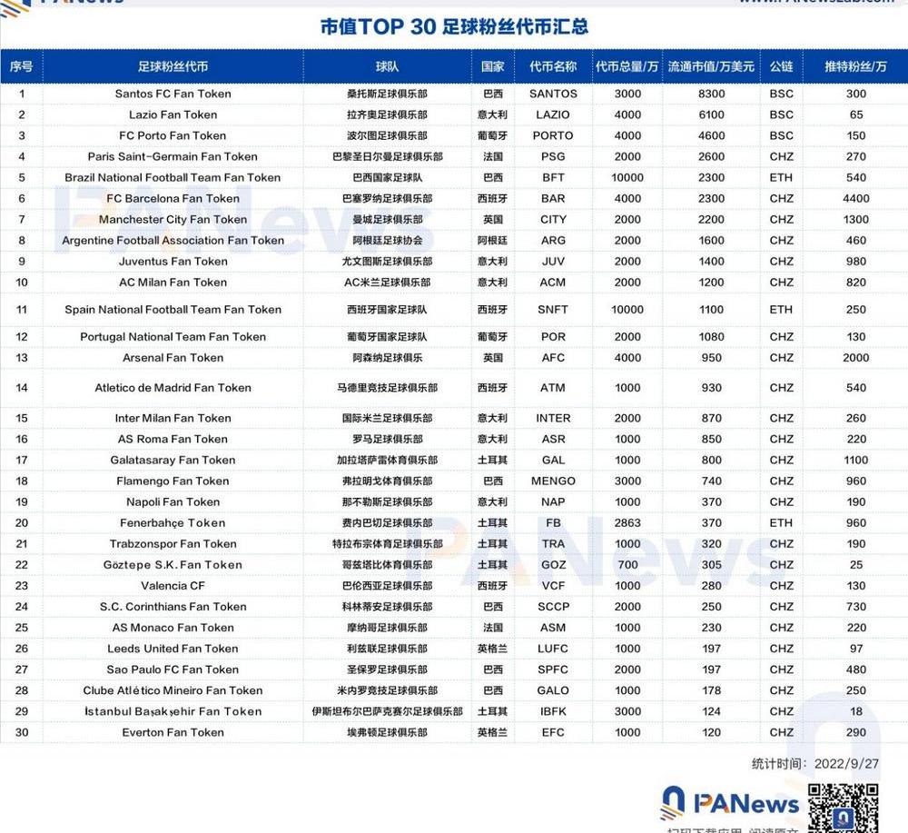 如果说每四年一次的减半是加密圈的狂欢,那么每四年一届的世界杯就是足球迷的盛典。2022年11月21日,第22届世界杯将在卡塔尔举行,和上一届世界杯35亿次的观看人数相比,本次世界杯的热度只增不减。作为足球第一盛会,世界杯背后涌动着无法估量的商机,巨大的流量和商业IP不仅吸引着各巨头品牌竞相代言,也牵动着加密市场的关注。早在2018年,基于世界杯概念的预测代币Wicc,在世界杯开始前三个月就一路飙升,最高达到10倍涨幅。币安在这一领域也是多次布局,2018年币安宣布投资专注于粉丝激励平台的公链Chiliz,目前粉丝代币大多是是基于Chiliz。2020年为四个足球代币在BinanceLaunchpool开启质押、2021年在Launchpad上线四个足球代币、今年六月份又与足球巨星C罗签订独家合作协议。OKX则在近期上线了多个足球代币为世界杯预热。目前距离世界杯已经不足两个月的时间,四年一届的世界杯流量、动辄千万粉丝的球队影响力、交易所的加持、以太坊合并后的热点空白足以让市场给予关注。本文PANews将按照市值盘点30个足球粉丝代币,为读者提供参考。但值得提醒的是,从目前市值前三的足球代币看、底部涨幅在6-14倍之间,尽管还没有达到前高,但在大熊市背景下仍需注意追高的盈亏比。此外在筹码分布上,PANews在盘点30多个足球代币后发现,大部分足球代币80%的筹码集中在前几名持有者手上,随着利好预期的不断释放,投资者需要注意不预测的砸盘风险。最后从足球代币的实际效用考虑,目前代币多是用于实体服装售卖、受欢迎球员投票、门票优惠。许多俱乐部承诺的持有者可参与球队发展的治理并没有实际落地。本文仅提供信息分享,不做投资建议,投资者需自行合理控制仓位和风险。