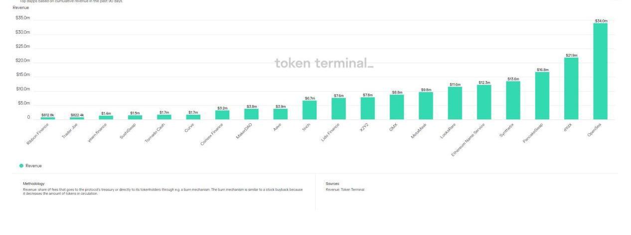 收入是指进入协议储备金库或直接进入代币持有人的费用收入份额,在过去的90天里:OpenSea以3400万美元收入排名第一DYDX:2200万美元PancakeSwap:1700万美元SNX:1400万美元ENS:1200万美元