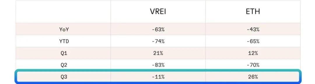 今年8月,标准普尔500指数和比特币分别上涨了约10%和25%,然后在9月底创下新低。ETH在8月份上涨了80%,本季度结束时比开始时高出约26%。由于大部分土地以ETH计价,因此以美元计算的VREI的价格变化变得特别不稳定。为了使ETH的波动正常化,下面的VREI图表显示了以ETH而不是美元计价的VREI的百分比变化。