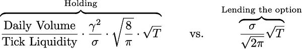 假设年波动率为100%,这意味着如果每日交易量/即时流动性比率大于以下值,持有期权只会产生大于借出期权的回报: