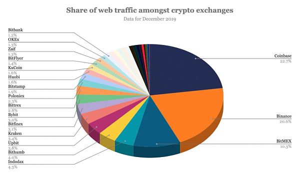 2019年12月,Coinbase,Binance,BitMEX三家交易所网站流量的合计市场占比超过50%。