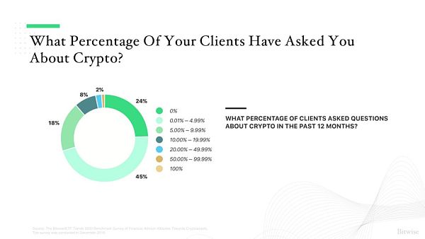 在已经将加密货币添加到客户投资组合的投资顾问中,有42%表示将继续提高加密货币的配置比例,剩余的表示将维持目前的比例。在未将加密货币添加到客户投资组合的受调查者中,有7%表示2020年将配置加密货币(2018年该调查为3.5%,传统投资顾问对加密货币的兴趣和认可度还是有较大提升的)。