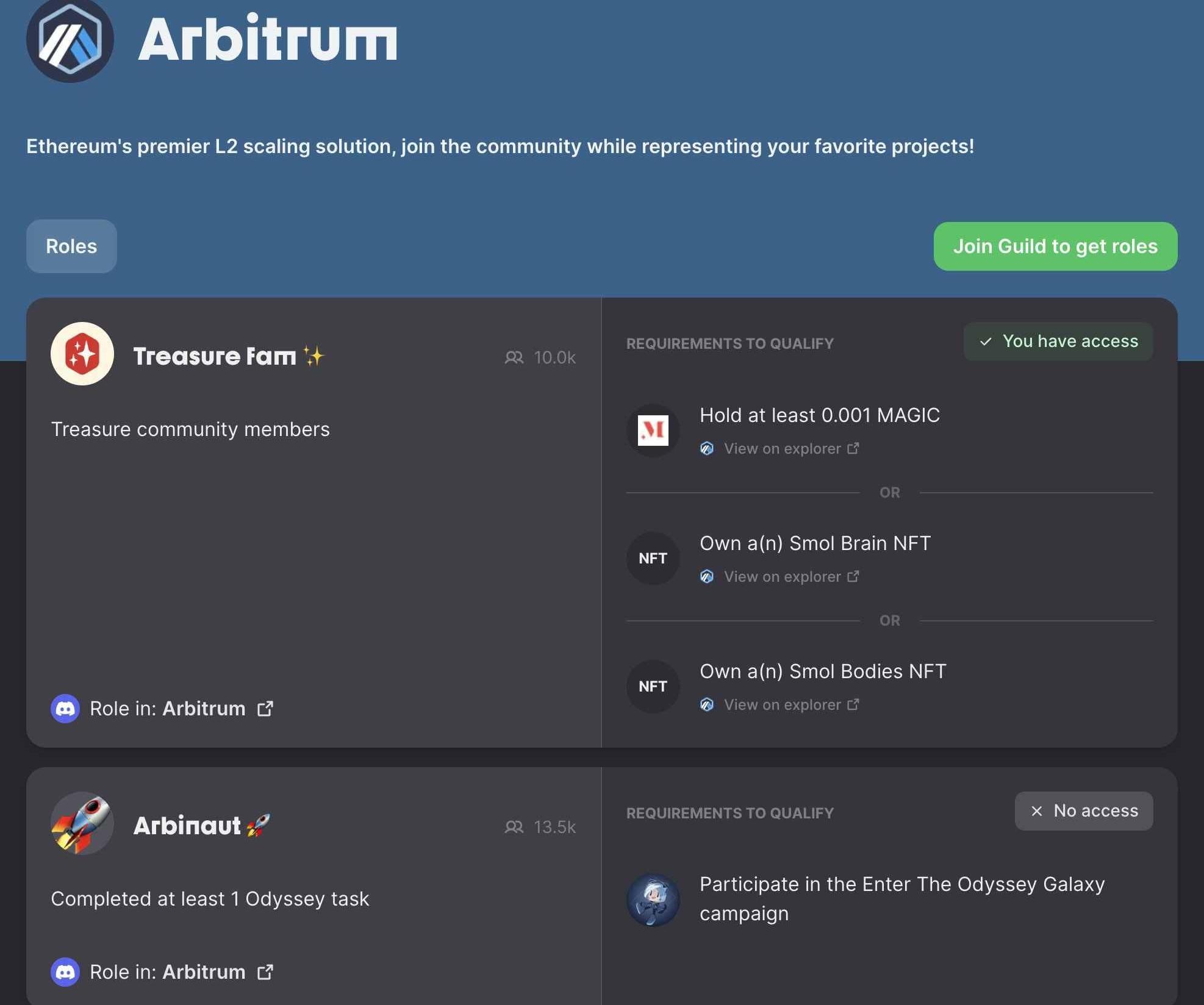 Guild是一个类似于RabbitHole的平台。用户可以通过完成任务获得奖励。Arbitrum最近发布了10个链上任务,这些任务也让你在其Discord中获得身份。如果发生空投,链上活动记录很可能会决定是否有资格获得ARBIToken。这是包含所有10个链上任务的Arbitrum官方链接。