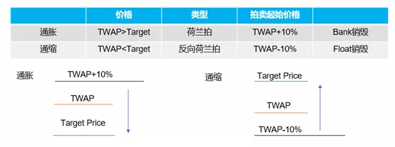 协议将每24小时监测FLOAT的时间加权平均价(TWAP)是否等于目标价格,如果不相等,系统则将进行拍卖(荷兰式),在拍卖的过程中,价格将逐渐降低(荷兰式)或逐渐升高(反荷兰式),依靠套利者推动价格向目标价靠拢。每次拍卖将持续150个区块,项目计划未来提高拍卖的频率,从每24小时逐渐过渡到取消固定的拍卖时间,由参与者组织进行拍卖。