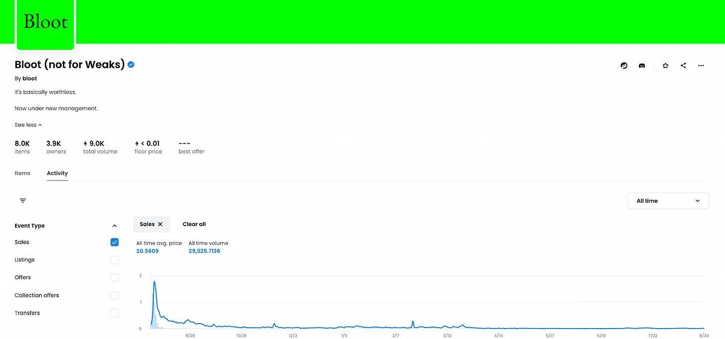 下面的项目就是例子,6.9%的创作者版税被提取,数百万美元消失于一场拉高出货的免费铸造游戏。Bloot是一个失败的项目,收藏者最终一无所获,但创作者团队从版税中获得了大量收益。