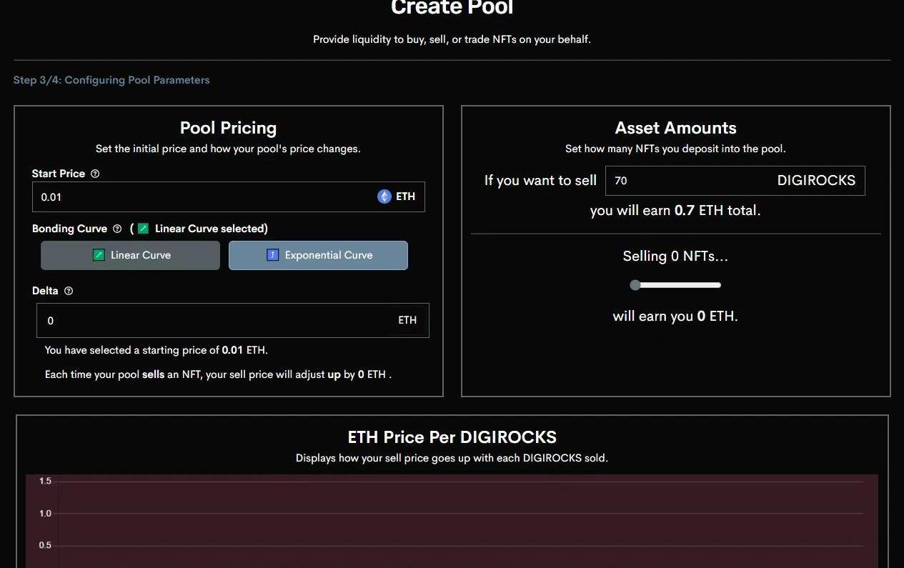在这个阶段,你可以设置NFT的价格点,它的联合曲线机制类型,以及在新的交易中它的价格变化的delta值。再次点击“下一步”。在接下来的页面中,点击“选择你的NFT+”,然后选择你想要入手的NFT,如下所示: