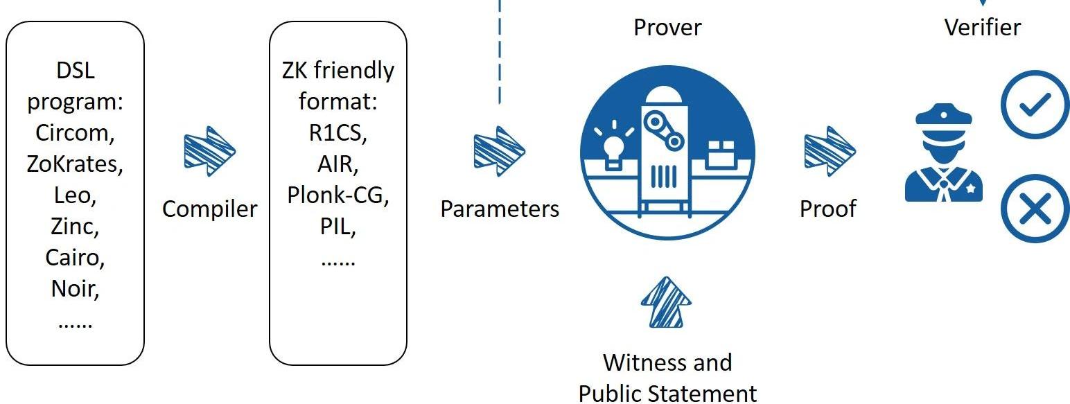 零知识证明允许一方在不需要透露任何额外信息的前提下,向另一方进行真实性证明。因此可以用来保护隐私,在隐藏所有细节的情况下证实交易的有效性。某些特定零知识协议在验证零知识证明上具有便利性,这很重要,例如STARK和SNARK。这些协议生成的证明较小,验证此类证明也会快很多。这很适合资源有限的区块链,并且在解决加密行业的可扩展性问题上尤为重要。除此之外,零知识技术的其他用例还包括:跨链桥——使用零知识证明进行状态转换或验证交易,例如AlograndASP,MystikoDID——在避免泄露详细信息的前提下,证明某个账号或实体具有某些"特征",例如Sismo,FirstBatch社区治理——用于匿名投票,并且在经过实践考验和广泛采用后,该用例可以延展至现实社会的治理中财务报表——实体可以在避免透露确切财务数据的前提下,证明其符合某些特定标准云服务的完整性——帮助云服务供应商更好地执行任务……一个典型的零知识系统工作原理如下:工程师首先用领域特定语言编写要验证的陈述,然后将其编译成适合零知识的格式,比如算数环路。使用该格式生成参数后,证明系统会将这些参数与其见证的保密信息一起作为输入值来运行证明计算。通过相对简单的计算,验证者可以凭参数和证明来决定是否通过验证。使用零知识汇总的情况下,程序或合约本身部署在layer2上,而编译过程、参数和证明的生成将由部分layer2节点在链下执行,之后在以太坊主网上发布和完成验证。一个典型的零知识系统