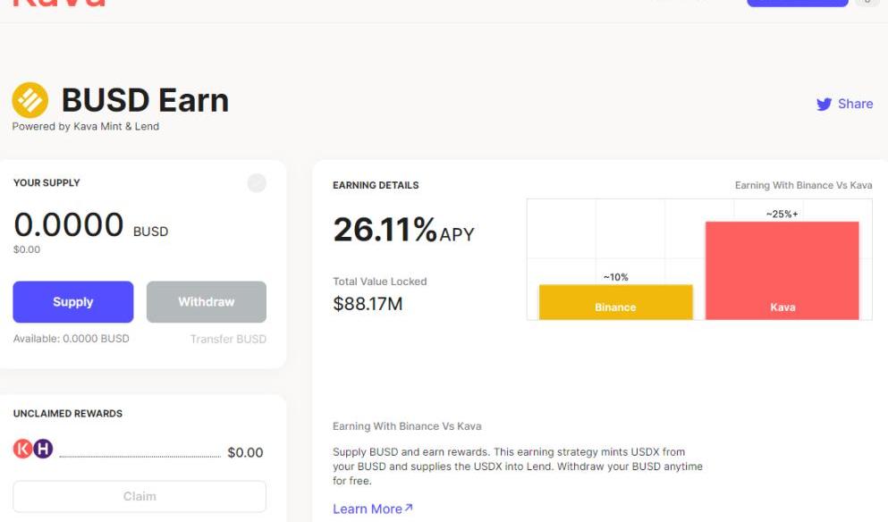 https://app.kava.io/earn/busdMAI以最广泛的抵押代币突破极限:支持10条链上的60种资产以0%的借贷利率铸造MAI。超越Maker的超额抵押创新