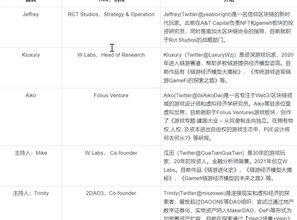 上周末和2DAO3一起组织了一次闭门会,人数控制在30人。邀请了RCT的Jeffrey、foliusventures的Aiko、Wlabs的Kluxury做主分享嘉宾,同时参加者有iosg,foresight,incuba,头等舱,链捕手,footprint等链游研究机构的伙伴,有香港中文大学专门研究经济体模型的教授,还有几个头部游戏厂商的web3团队。全场都是干货,直接讨论痛点和创新模型,甚至具体到如”如何引导玩家在项目官网交易而不是去opensea”等问题,谢谢各位的参加!现在把一些会议节选和瓜友们共享。一,组织介绍