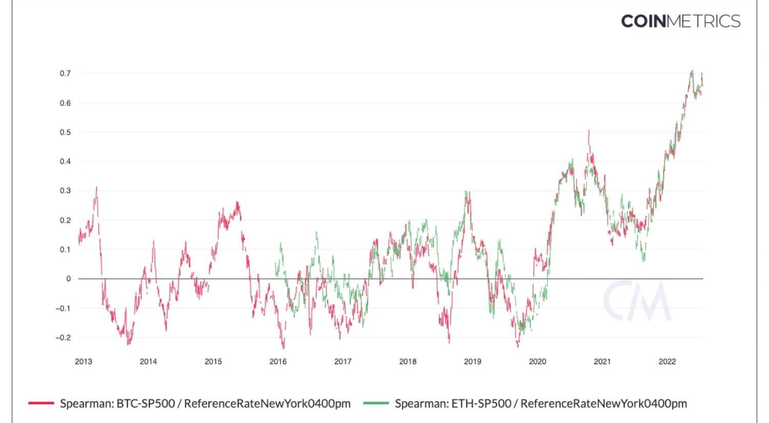 加密货币作为一种资产类别,随着其市场的逐渐成熟以及机构投资者的不断涌入,这也意味着像比特币和以太坊这样的大市值加密货币的价格正变得与更容易更广泛的金融市场交织在一起。直到2020年,比特币和以太坊与标准普尔500指数的相关性上升才被观察到,如下图所示。与以往相比,股票和加密货币的价格增长仍然高度相关,在2022年5月达到历史最高水平。