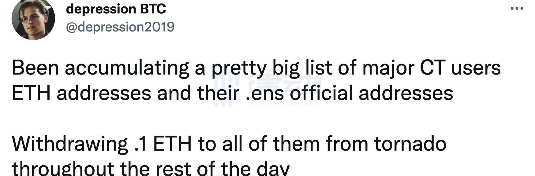 在监管消息传出后不久,名为@Depression2019的用户就在Twitter上发文,表示自己积累了大量名人以及KOL的钱包地址,并会通过TornadoCash向这些发送0.1ETH。不少用户纷纷在下方互动,以为这种公开反抗监管的行为只是说笑。