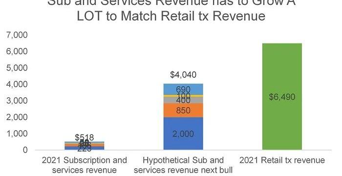 接下来,让我们按照最乐观的假设状况来估算一下这些收入流来源未来前景——1、区块链奖励收入:这个收入来源是Coinbase从运行验证者获得的质押奖励。假设到下一个周期,以太坊可以达到1万亿美元上限并以30%的质押率产生5%的质押收益率,相当于每年质押150亿美元的可寻址市值,倘若Coinbase可以一直保持当前14%的网络市场份额,那么相当于可以获得约20亿美元的区块奖励收入。2、托管费收入:Coinbase会向其客户收取托管加密资产的费用。2021年,Coinbase托管的加密资产价值达到2340亿美元并从中赚取了1.36亿美元的托管费收入,这意味着期托管费率约为0.06%。假设下一个周期总加密市值达到10万亿美元,同时Coinbase保持当前托管资产的市场份额,那么其托管收入将增长6.25倍达到8.5亿美元。3、利息收入:Coinbase会从通过平台托管客户的法定基金赚取的利息收入中获得分成,假设这个收入项目随着托管费收入的增长而增长,大约可以获得约4亿美元的收入。4、佣金赚取活动收入:对于参与特定区块链协议教育内容的客户,Coinbase会从他们赚取的加密货币中抽取佣金,预计下一周期可以获得约1亿美元的收入。5、其他订阅和服务收入:这笔收入主要来自加密基础设施平台CoinbaseCloud,假设这一收入来源能在下一个周期增长10倍,预计Coinbase可以获得6.9亿美元收入。综上,你会发现即便在最乐观情况下,Coinbase可以获得总计约40亿美元的订阅和服务收入,远低于Coinbase在2021年获得的65亿美元零售交易收入,而且我们还没有考虑Coinbase需要面临来自Binance和FTX日益残酷的市场竞争。