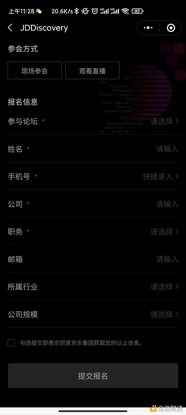 领取:在报名阶段(10月19日~11月22日),用户扫描小程序码选择参与大会的方式和具体的主题论坛,提交报名资料后即可免费获得带有京东JOY徽章的NFT纪念凭证。