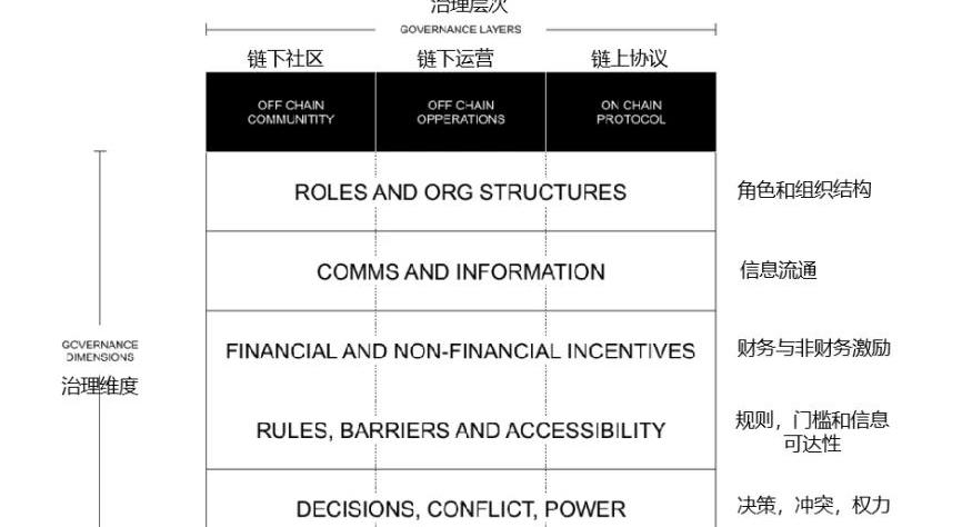 DAO人种学是一个新兴的领域。当我们描绘这个新领域时,我们也在形成一种新的研究方法。按照Vitalik的“e-theory-umblockchain”,及其对wordcel理论而非经验主义的强调,协议不仅仅是关于技术、经济机制以及正式的安全保证。更重要的是,它是一个活生生的社会有机体,与它的人类参与者和它所处的环境一起演变。因此,我们选择了一种定性的方法,来挖掘这些主观的、创造意义的,把协议塑造为一个社会系统的实践和动因,并特别关注如何应用于人类主导的协议治理这一新兴领域。借鉴CliffordGeertz开创的解释学方法,即强调行为和思想表达的文化背景,我们组织了对20个利益相关者的深入访谈。然后,我们根据Pelt等人的工作所提供的分析框架对其进行编码。这个框架使我们能够根据不同类别的组合来确定问题。三个治理层:链下社区:在Uniswap的例子中,社交的动因和关系发生在Uniswap的社交环境中,并向更下层的治理层提供信息。链下操作:表示在正式的链上投票之外进行的治理事项,特别是关于协议和生态系统的发展和维护。UGP和TheStable就属于这个类别。正如我们将看到的,在Uniswap中正式的链下操作的例子并不多。链上协议:是指智能合约中编码的互动机制和规则,治理过程正是通过这些机制和规则来起作用的。在Uniswap的案例中,这一层与GovernorBravo的能力有关,它是制定影响协议参数的决定的基础设施。以下是在开源软件和区块链领域的治理中,最为关键的5个维度:角色和组织结构:参与者的组织层次和问责机制;信息流通:沟通交流所使用的媒介渠道;财务与非财务激励:对不同参与者的货币化和非货币化奖励;规则,门槛和信息可达性:关于参与和成员标准决策,冲突,权力:决策形成的流程和机制;经过分析,我们对Uniswap治理中的一些关键问题有了多方面的、细致的理解。