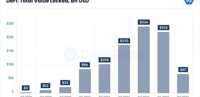 资料来源:DappRadarTerra崩溃对DeFi市场产生巨大影响,导致总锁仓量跌至2021年初水平,本文撰写时仅为700亿美元左右,比2022年一季度末减少69%,比一年前下降33%。
