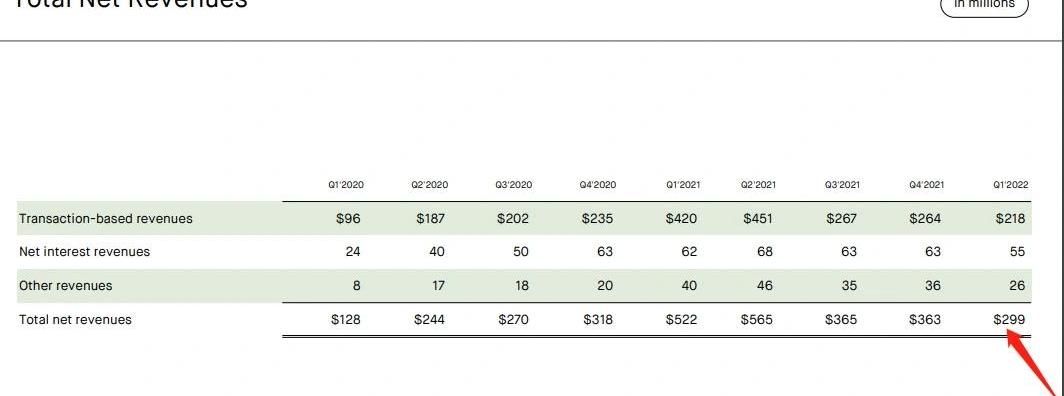 RobinhoodCrypto于2018年推出,直接与Coinbase等加密货币经纪公司竞争,罗宾汉优势在于其提供免佣金交易服务。在21年第一季度,950万客户在平台上交易比特币、以太坊和狗狗币等加密货币——比上一季度增长458%。22年一季度末公司平台沉淀的加密资产规模来到接近200亿美元,而同期Coinbase平台沉淀加密资产规模为2560亿美元。RobinhoodCrypto相对较弱的地方在于它缺乏转账或取款功能:客户目前无法将他们的加密资产转入或转出他们的账户。