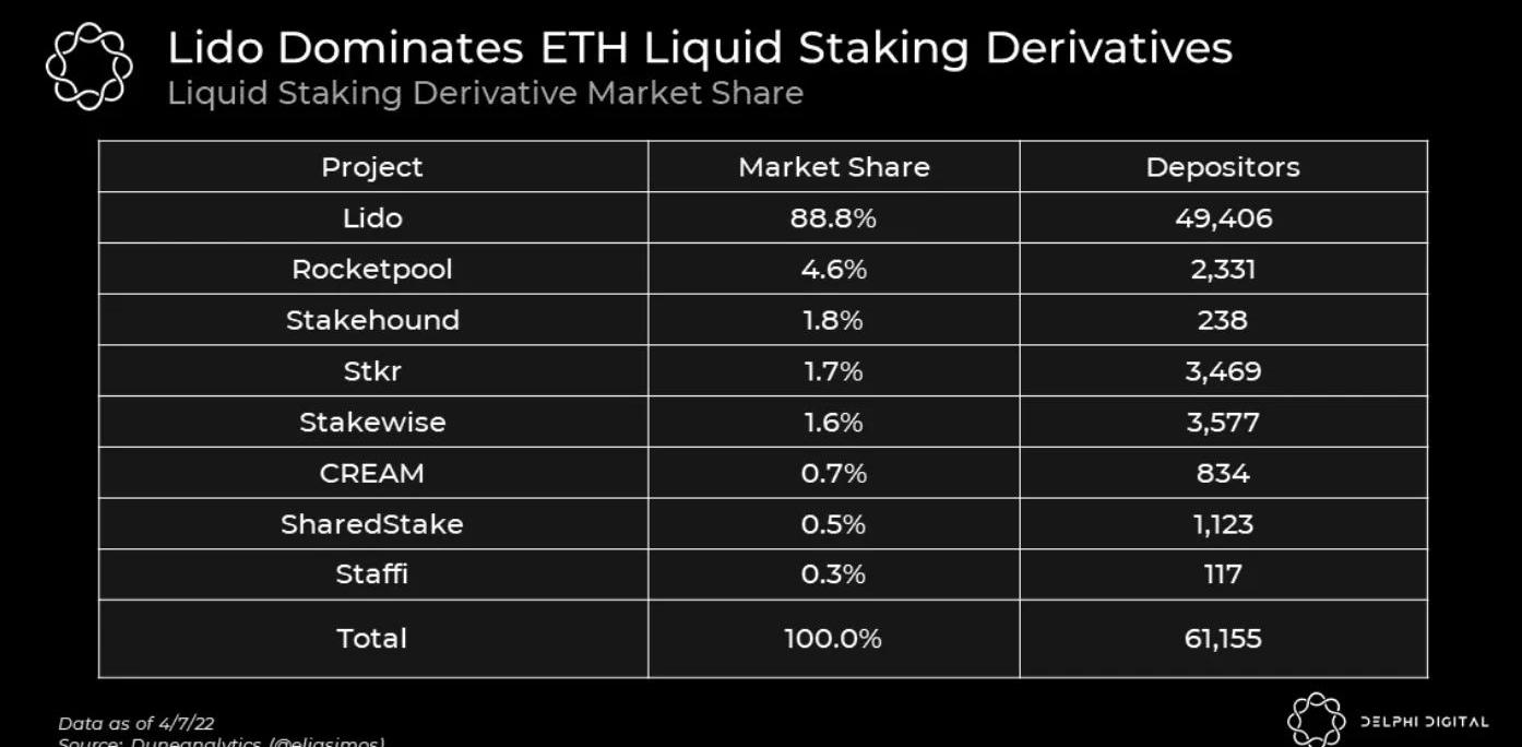 资料来源:以太坊2.0信标链区块链浏览器——质押池服务概述对于液态质押来说,Lido在市场上占主导地位。液态质押衍生品帮助用户将其质押资产变现,从而提高资本效率。