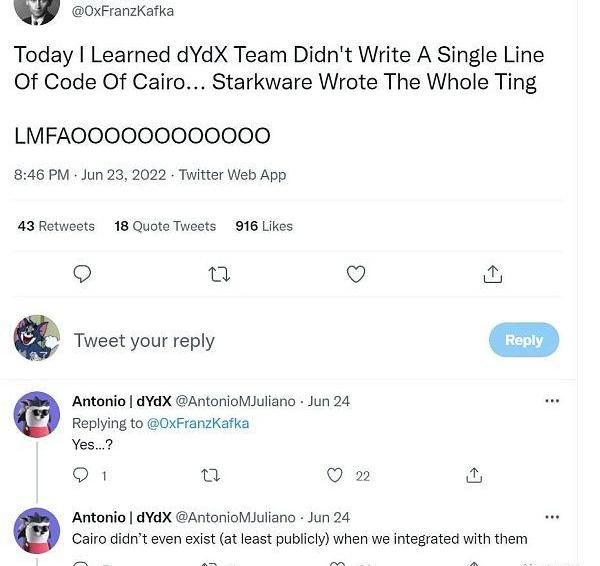 另一个可能的原因:对于starkware生态的原生归属感不强烈cairo和solidity是两种完全不同的编程语言,并且从逻辑上没有互通性,并且在当时基本上是starkwarelabs帮助dYdX完成了整个cairo代码的编写。所以,从项目方的角度出发并没有多少对于这个语言乃至于生态的归属感。