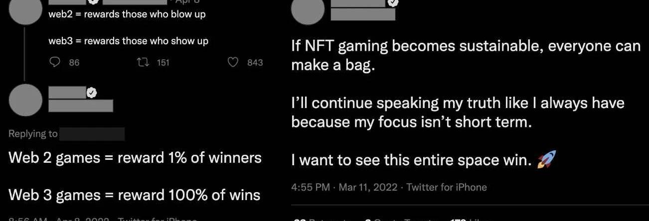 在制作游戏时,创始人必须时刻关注前期设想与后期成品之间的区别。很多时候,创始人都以为自己打造了一款「以玩为先」的游戏,但实际上却设置了所有与「以赚为先」类游戏一样的营销策略。不过,我们完全可以通过该游戏账号发布的推文比例来加以判断,看是与游戏本身相关的内容多,还是与Crypto相关的内容多。游戏开发者可能都会陷入这样一个错误认知:认为游戏可以先做成一颗「以赚为先」的游戏,之后再转变为「以玩为先」。虽然这听起来很有吸引力,但其实如果按照这种模式的话,反而两类玩家都不会感到满意。这就像是那些想在创建之后再完成去中心化的区块链一样,通常都是行不通的。类似的情况也出现在FreetoPlay游戏中,这类游戏要么是为处理微交易而建,要么是为娱乐性而建,而后者一般建立在前者的基础上。例如,《堡垒之夜》在一开始是一款完全免费的游戏,是在火起来以后才加入的变现机制;而像Farmville这样的游戏在创建时首先考虑到是变现问题,然后才是游戏性。但按照BrooksBrown的话说,如果一款游戏是「以赚为先」,那么它就不会有多少游戏性了。如果游戏想在较短的时间内获得成功,那他们当下可能更愿意开发一款「以赚为先」的Crypto游戏。然而,如果开发者想建立一个「以玩为先」的游戏,那他们要么尝试化解社区对于Crypto游戏的厌恶,或者将游戏打造的足够完备,从而吸引社区的加入。从长远来看,用过高的奖励获取日活跃用户对于「以玩优先」类游戏并不是一件好事。「以赚为先」类游戏的未来
