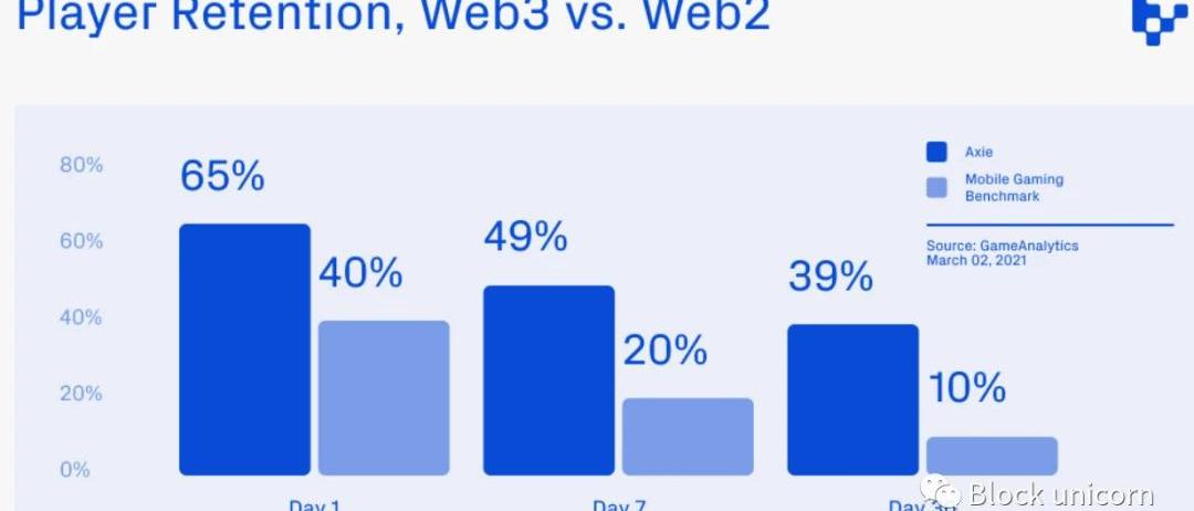 AxieInfinity由玩家在游戏中赚取可兑换当地货币的代币的“play-to-earn”机制提供支持,已经实现了可观的规模,累计收入超过10亿美元,日活跃用户近300万。并且游戏的玩家留存率大大高于传统手游。随着时间的推移,AxieInfinity的玩家留存率一直保持强劲和稳定,这表明参与度不仅仅是游戏新颖性的一个功能。