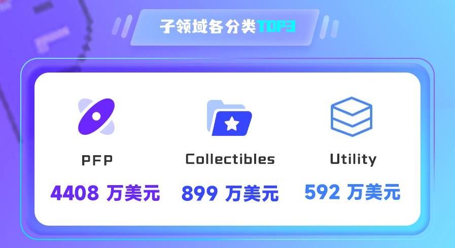 按过去24小时成交量,排前三的子领域分别为PFP、Collectibles和Utility。