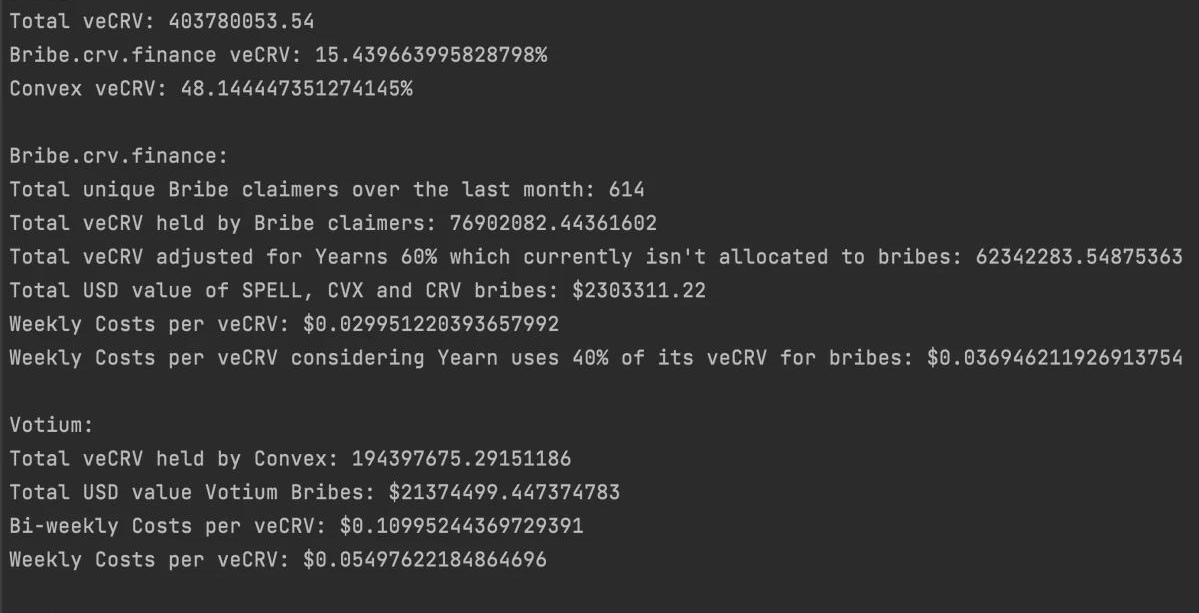 与Bribe平台逻辑类似,投票权的买方可以在Votium平台上提供贿赂奖励,以引导更多的vlCVX的投票权投入自己指定的资金池。Votium平台上的投票每两周进行一次,也就意味着每两周买方都需要提供新一轮的贿赂资金。在上一轮的投票中,FRAX与Terra共计提供了价值约$11.74M的贿赂资金,每个vlCVX代币获得了价值约$0.45的贿赂奖励。如果贿赂的成本保持不变的话,那么Terra和Frax一年在贿赂上付出的成本就会达到$306M,对应当前Curve平台两个项目代币的TVL,其支付的贿赂年化成本就高达13.5%,考虑到Terra和Frax已经花费了大量资金在购入CVX代币上,因此与Anchor约20%的年化利率成本相比,除了为其代币链上交易提供了更充足的流动性外,并没有有效降低依靠激励维护其代币流通量的成本。并且伴随着Convex投票权更加激烈的竞争,其贿赂成本还会逐渐增高。关于两个平台上贿赂成本的对比,@0xSEM对三月Bribe.crv与VotiumRound15的数据进行了对比,结果是Votium上进行的贿赂的成本要高出约48%,也就意味着Votium上的行贿方如果使用Bribe.crv可以获得更高的资金效率。但是当CurveWar的参与方意识到这个成本差距后,当前两个平台的贿赂成本差距已经被拉小,并且会逐渐趋于持平。