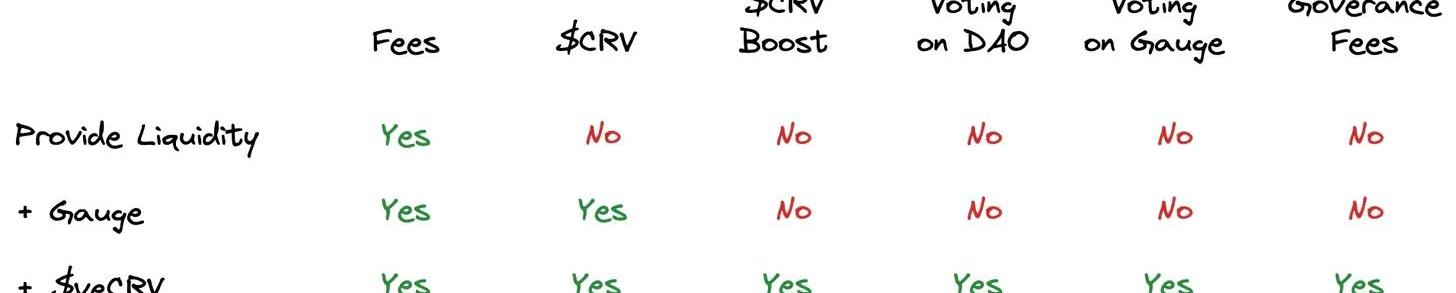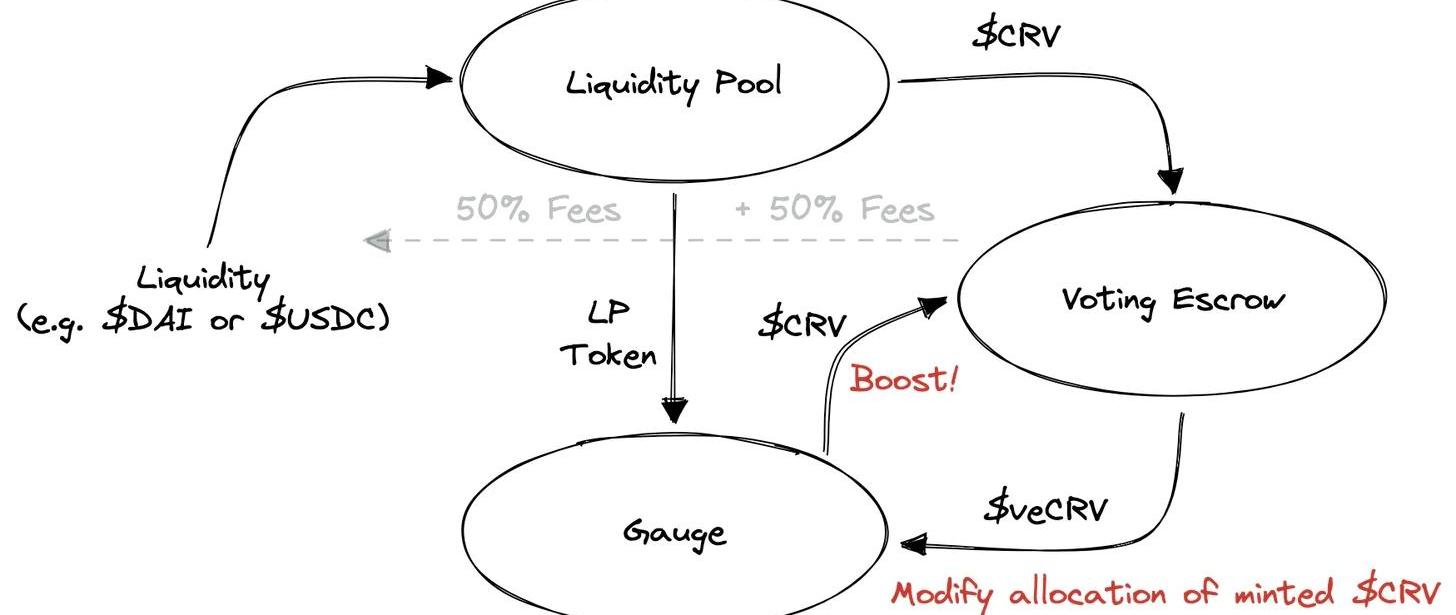 站在Curve的流动性提供者的角度,当他们为Curve上的流动性池提供流动性后,会获得对应交易手续费的50%以及流动性挖矿的$CRV代币奖励。为了获得更多的收益,他们需要将CRV代币锁仓获得veCRV代币来分享剩余的50%交易手续费并且可以增加自己的$CRV奖励到最高2.5倍,同时基于CurveGauge机制,veCRV的持有者可以投票选择支持的资金池以增加其比重,从而对应资金池的LP会获得更多的$CRV奖励。