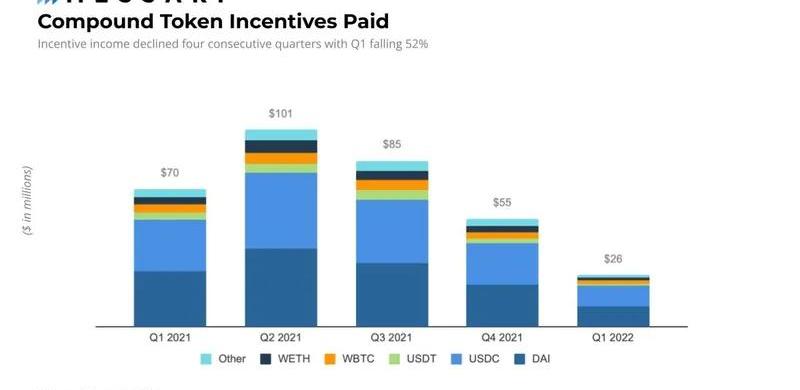 作为存款人和借款人活动的关键驱动力的COMP代币激励在第一季度急剧下降了52%。Compound治理在第一季度末通过了一项提案,将COMP激励减少50%,并计划取消激励。鉴于这些计划,第二季度COMP代币激励应该会迅速下降。