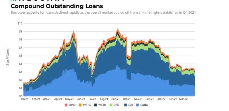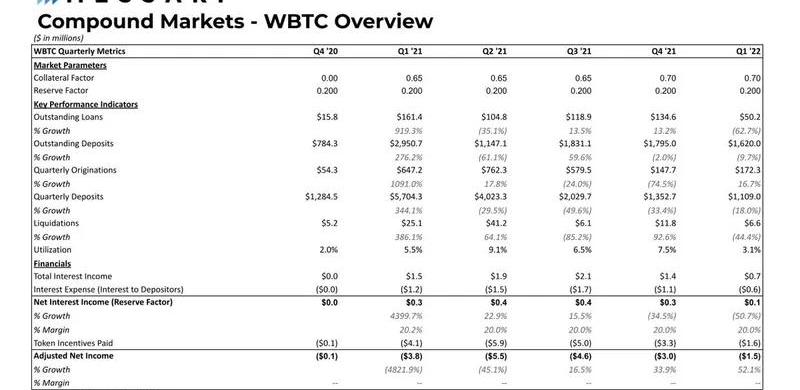WBTC是该协议前五名市场中唯一一个未偿存款下降9.7%的资产,从2021年第四季度的18亿美元降至第一季度的16亿美元。相比之下,未偿还贷款从第四季度的1.34亿美元下降62.7%至本季度末的5000万美元。