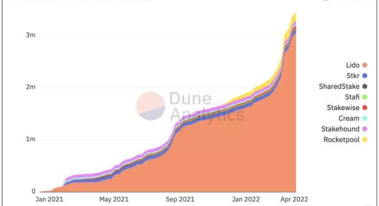 RocketPool协议中存入的ETH总量增长情况与Lido不同,RocketPool选择不追求多链策略——相反,该协议选择专注于以太坊。虽然这种专门化可能有助于该项目在这个利基市场中站稳地位,并让自己受到以太坊社区的喜爱,但这最终限制了RocketPool相对于其主要竞争对手的潜在市场。
