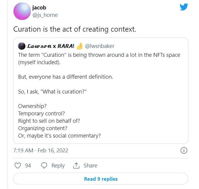 那么,什么是策展?Zora的创始人JacobHorn提供了最佳答案。