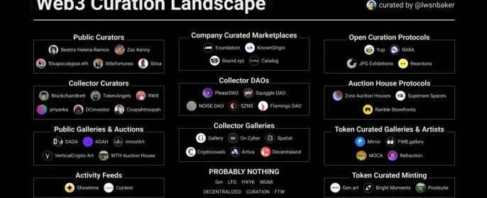 Web3策展中最有争议的领域是NFT市场,这些公司通过控制谁可以铸造NFT以及支持哪些媒体类型来策展市场的氛围。Foundation对设计、摄影和最好的互联网meme方面的艺术家进行了出色的策展。其他如Catalog,专注于特定类型的媒体,如MP3。其他公司策展的市场包括KnownOrigin,Sound,SuperRare,NiftyGateway,AsyncArt,NiftyComedians,以及其他等等。即时动态