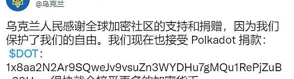 同时,德国财政部长ChristianLindner在会议结束后的一份声明中表示,“采取措施防止受制裁的个人和机构转向不受监管的加密货币”。乌克兰接受DOT捐赠,创始人GavinWood兑现580万美元承诺乌克兰官方推特表示,它现在将接受来自Polkadot(DOT)的捐款,而其他加密货币也将很快加入。