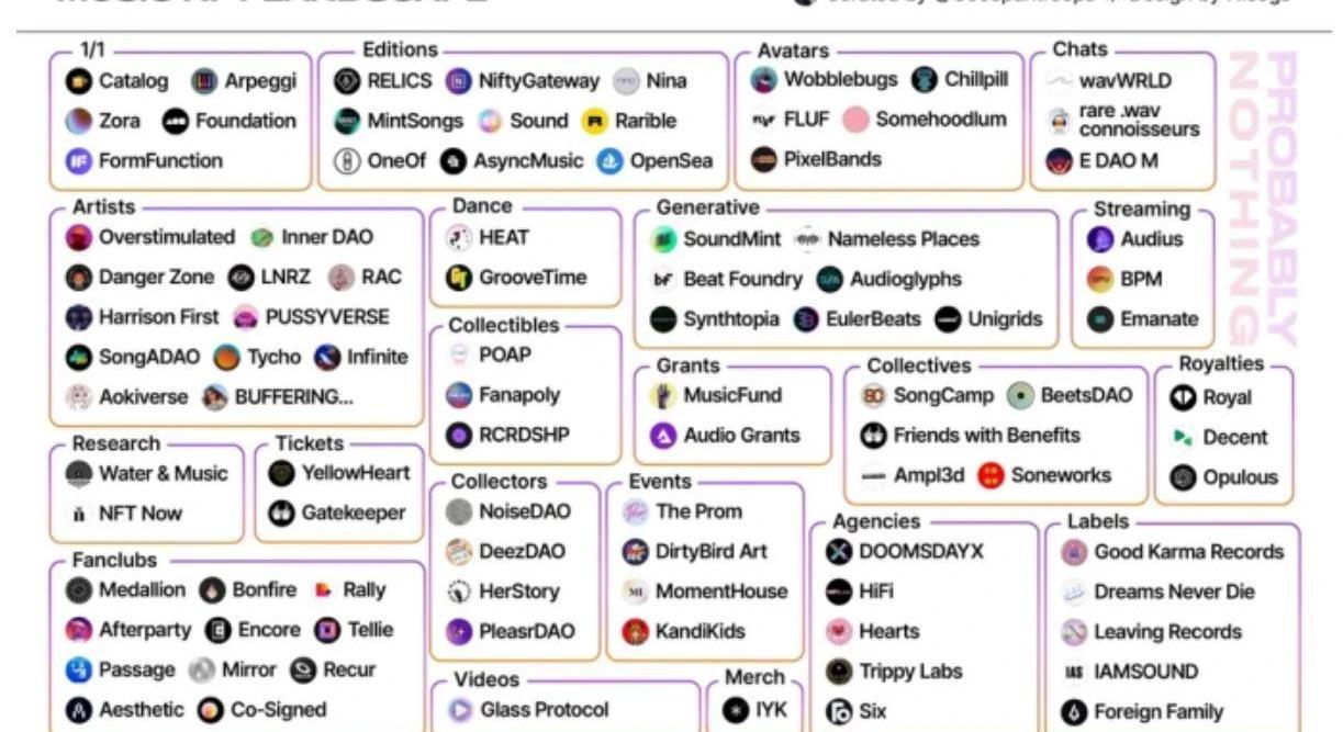 NFT的复兴正在将所有的媒体从传统的格式和商业模式转变为数字化的原生模式。视觉艺术一直是突出的形式,其销量已达数十亿美元,且市场规模和参与者还在持续增长。艺术NFT已经看到了围绕个人资料图片、生成性收藏品、视觉效果、数字/实物作品、游戏对象等的交易活动。通常情况下,艺术NFT的所有者在利润之外发现艺术和艺人的内在价值,而蓝筹收藏品也已经做得很好了,尽管NFT的投资在很大程度上缺乏流动性。音乐被证明是一种更复杂的情况,因为它牵涉到许多人/实体的多层创作和生产努力。与静态图像相比,音频内容是动态的,需要在声音、创作和制作价值方面进行迭代,然后才能达到最终的形式。然而,NFT对音乐的影响似乎是艺人和建设者都在努力弄清楚的事情,因为NFT为艺人提供了更多的机会,以释放更多的收入和机会渠道,包括将粉丝带入其中。市场很快就形成了一个共识:NFT将重组整个音乐产业,首先是改变音乐的创作和消费方式。目前的竞争环境