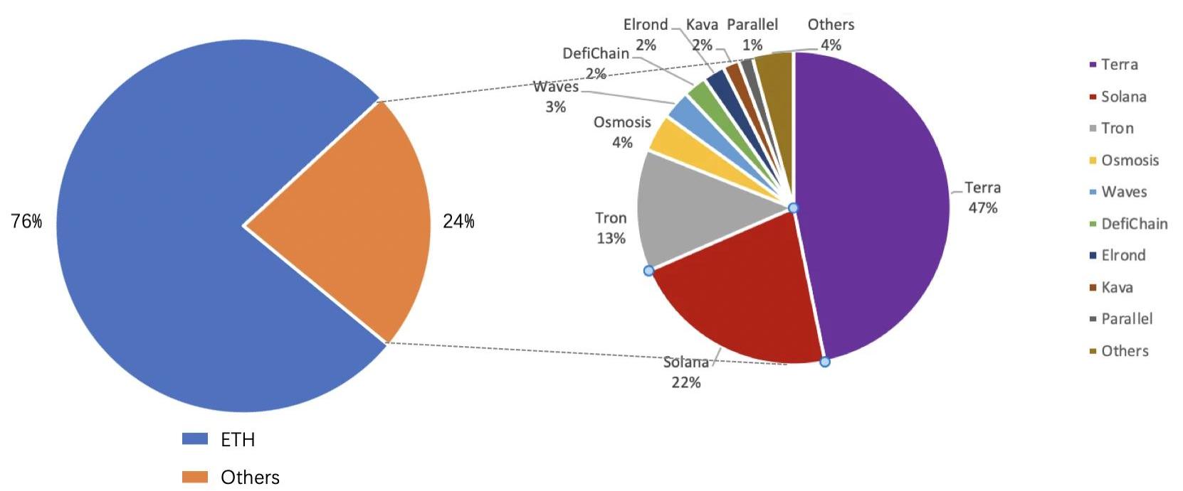 图2:2022年2月TotalValueLockedLayer2Chains其他Layer1:Solana、Near等独立于EVM的新公链在2021年实现了显著增长,虽然产生这一现象的部分原因是外部资本的持续运作,但低廉的Gasfee确实击中了Ethereum的痛点,Solana、Near等新公链满足了一部分用户的需求,创造了真实价值,也吸引了众多圈外用户。但鉴于EVM仍然是市场的绝对核心(如图3所示),开发者更容易复用以及基于EVM开发的众多基础设施,Near顺势推出了Aurora,Cosmos也即将推出Evmos以求实现和Ethereum生态的对接。另外类似于Layer2的专属链,Layer1也出现了很多聚焦不同领域的专属链,比如专注于NFT领域的Flow,专供隐私交易的Oasis,此外还有众多游戏公链如Gala、WAX、WEMIX等。