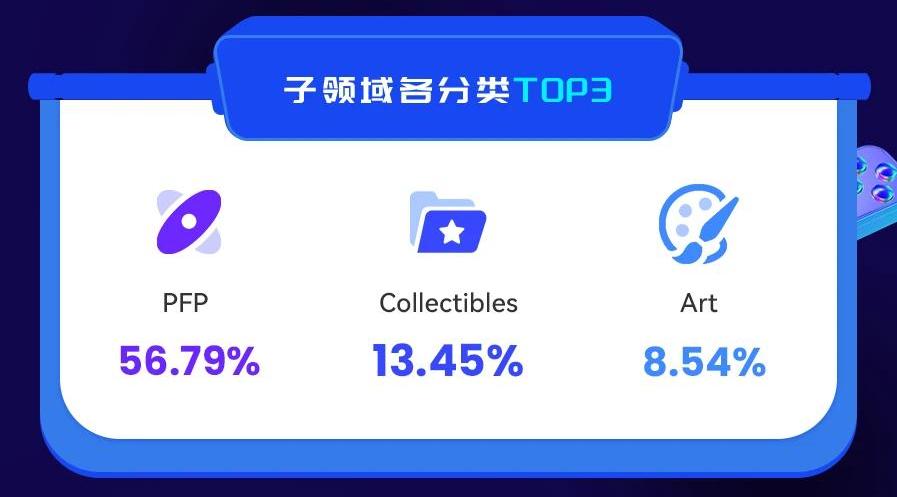 按市场占比,排前三的子领域分别为PFP、Collectibles、Art。