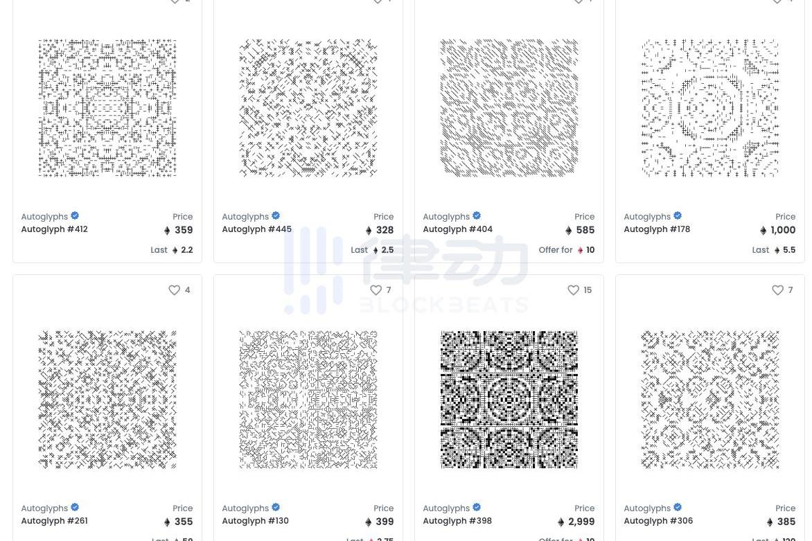 链上存储也常被习惯性地称为「永久存储」,因为一旦用户将数据提交上链,依靠区块链的不可篡改属性,上链的数据理论上便得到了永久保存。只要我们可以预期这条链能够永久地运行下去,那么相应的数据便等同于进行了永久保存。当前采用链上存储的项目也可分为两类,一种是将元数据存储到NFT智能合约的同一条公链上,另一种是存储在专用存储公链如Arweave上。当前采用第二种方案的典型项目还不多,因此本文便不做过多介绍,下面仅对存储于以太坊上的典型项目进行分析。AutoglyphsAutoglyphs项目同样由开发了CryptoPunks的LarvaLabs团队开发。这个产品相对CryptoPunks来说并没有那么知名,其外观的构成元素也较为单一。下图展示了其中的部分产品形态。