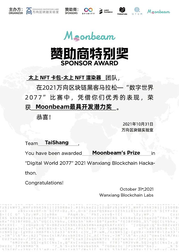 Web3go、Walnut、AmaraLink、太上NF卡包-太上NFT渲染器获得了Moonbeam最具开发潜力奖。四支团队将获得由Moonbeam提供的大赛奖励,更有Moonbeam Grants加速计划、项目部署技术支持、Moonbeam全球大使市场资源等多种隐形福利支持项目发展。