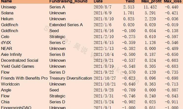 多数投资者喜欢追踪项目的融资信息,以此作为项目资质的评判标准。本文详细统计了自2020年7月以来的590个已发Token项目的融资信息,计算自融资信息公布以来的收益率、最大收益和最大亏损。从两个角度呈现VC对投资者的借鉴意义。第一,从VC角度出发,列举40家知名VC的投资情况,计算其损益。第二,从项目角度出发,筛选业绩表现较好的项目,挖掘其背后的VC。之所以不统计2020年7月以前的数据,是因为当时的融资信息比较凌乱,大部分都没有披露。本报告存在很大的局限性,需要读者注意:非常重要的一点是,项目token的损益不是从发行日开始算起,而是从融资信息公布日开始算。以AxieInfinity为例,该项目发行至今上涨了超过300倍,a16z与Paradigm等一众知名VC都参与了其B轮融资,但如果按发行以来的收益率计算就会高估他们的实际收益率。事实上,B轮融资是去年10月公布的,而Axie的暴涨发生在去年夏天,如果只计算10月以来收益率,那么真实数字为-50%。那么VC的真实收益率就是-50%?也不尽然!我们不知道他们的成本价,更不知道他们的退出价,也无法知道在不同项目的金额分配。因此用这种方式衡量VC的投资能力过于想当然了。本文计算的所有收益率均不代表VC投资业绩,只是衡量融资信息对于投资者的参考价值。部分项目存在多轮融资,上述590个项目共有685条融资数据。所有融资数据均来自DoveMetrics,价格数据均来自CoinGecko,数据截至2022年2月10日。此外需要注意的是,对于顶级VC来说,投资收益曲线拉长,例如它们在2020年7月以前投资的一些项目,也会在这之后获得高额回报,本文没有进行相关统计。知名VC40家VC按照投资信息公布以来的收益率排序: