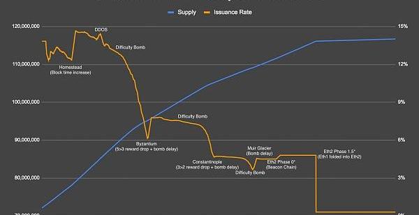 将“以太坊2.0”想象成一个单独的区块链并不准确,可以看作是由「一组升级」构成,这些升级包括创造一个叫作“信标链”的新链以及分片,分片可以包括多达64条链,主网将与这些并行系统“合并”。简单来说分为三个阶段,即信标链、合并和分片。尽管每个阶段所涉及的技术升级都在并行发展,但目前的顺序为信标链→合并→分片。信标链之前被广泛称为“以太坊2.0”第0阶段的PoS信标链于2020年12月上线。信标链旨在管理或协调扩展的分片和PoS网络质押,以太坊用户可以将其ETH锁定在智能合约中以帮助保护网络。作为交换,他们将从质押中获得收益。合并最初,信标链与当前的主网分开运行。虽然信标链使用PoS共识机制并行运行,但目前以太坊主网仍继续通过PoW共识机制得到保护。合并是使这两个系统最终融合在一起。准备就绪后,以太坊主网将与信标链“合并”,主网将把运行智能合约的能力以及完整历史和当前状态引入PoS系统。这将标志着以太坊PoW共识机制的结束,并开启一个更可持续、更环保的时代。此时,以太坊将更接近实现其愿景中描述的全面、安全和可持续性。一旦合并发生,将由质押者来验证以太坊主网。不再需要GPU挖矿,之前的矿工可能会投入到新的PoS系统中。根据ConsenSys举办的信息会议,三名致力于合并技术的研究员认为以太坊主网与PoS信标链的合并将网络能源使用量减少至少99.95%。此外,合并还将缓解:PoW共识机制是不可持续的,也不能长期扩展。PoS共识机制使更多用户更容易参与网络,而不仅仅是大型矿工。值得注意的是,一旦完成合并后,可能会出现“三重减半”的情况。“三重减半”为社区命名,是对比特币产量“减半”的致敬,表示一旦合并发生并且以太坊完全升级为PoS后,ETH发行量将大幅下降。在当前的PoW模型下,以太坊每天发行大约13,500枚ETH——每年发行量占ETH总供应链的约4.3%。但是,PoS模型是根据网络上积极质押的ETH数量来确定的。根据预测,当“合并”发生时,发行率将大幅下降。当“三重减半”与EIP-1559的销毁机制相结合时,预计以太坊的发行实际上将在用户活跃期间变得通货紧缩。尽管ETH的发行率降低且区块奖励减少,但网络奖励的更平等分配将使更多用户受益。