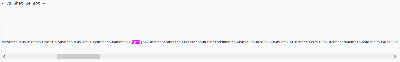 对于潜在的0day(零日)漏洞,这似乎是一个很有希望的线索。如果我可以 Etherscan 将非元数据解释为元数据,那么我将能够在标记为 {ipfs} 的区域中调整我部署的字节码,同时仍然让它验证为合法的字节码。